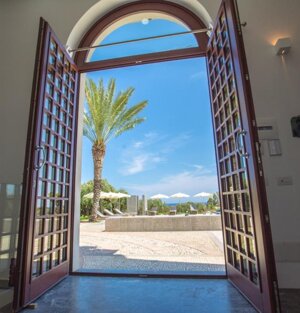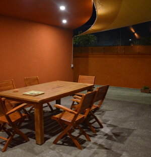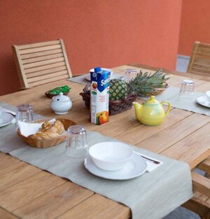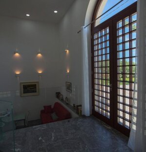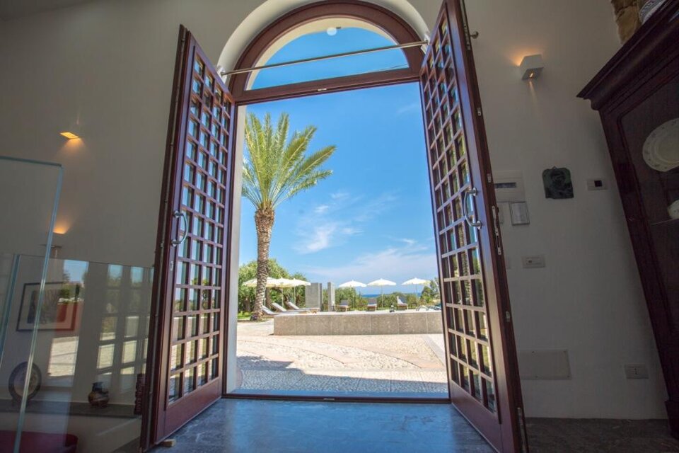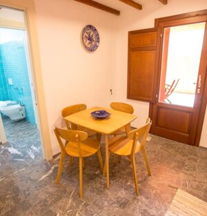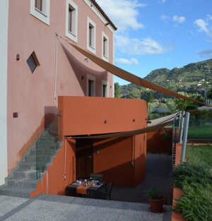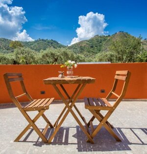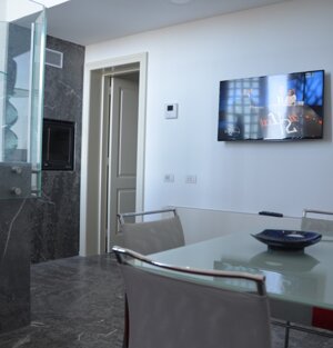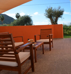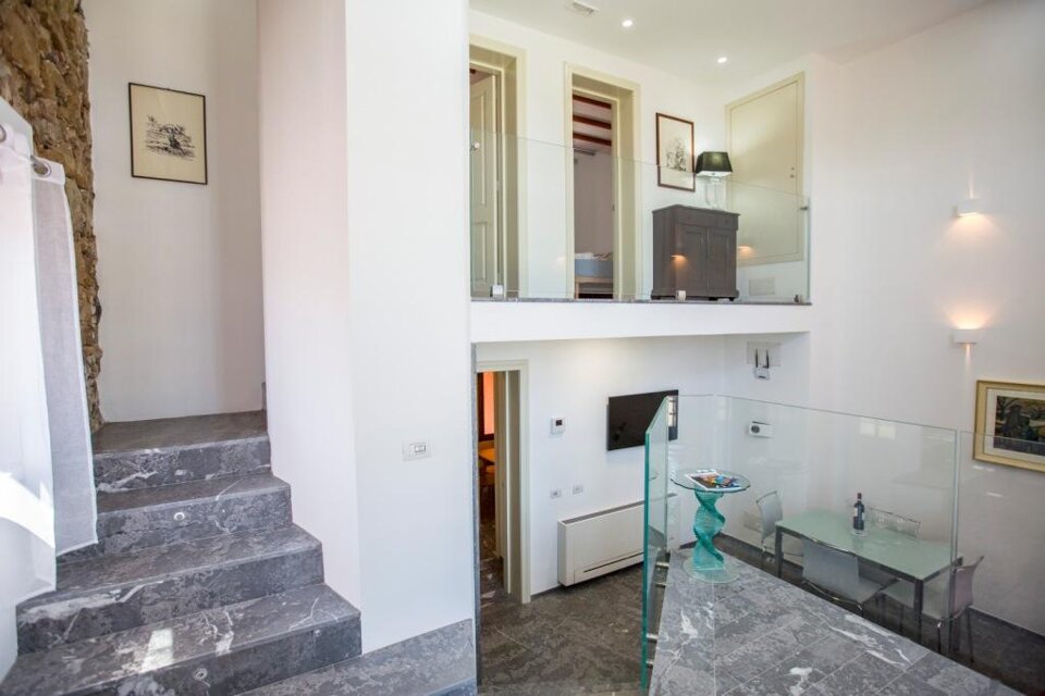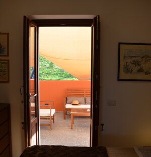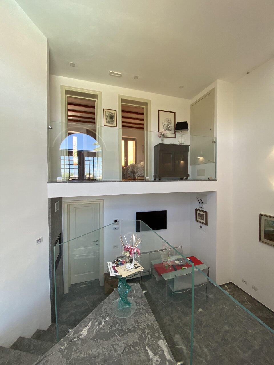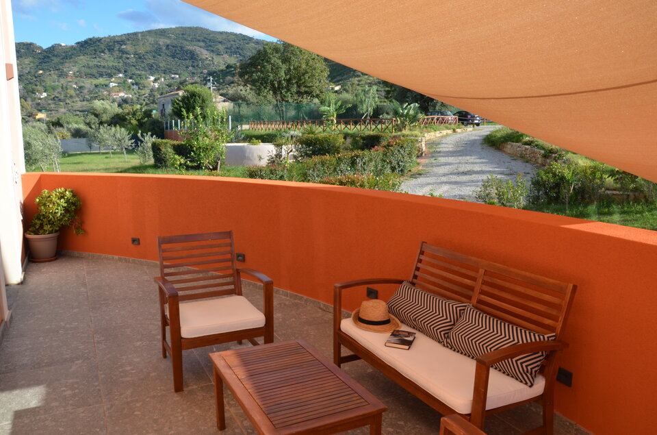 Portico esterno attrezzato per mangiare all'aperto. Dalle camere da letto si può accedere ad un ampio terrazzo attrezzato con tavolini che affaccia sulle colline retrostanti. La pavimentazione dell'appartamento è in marmo e parquet.